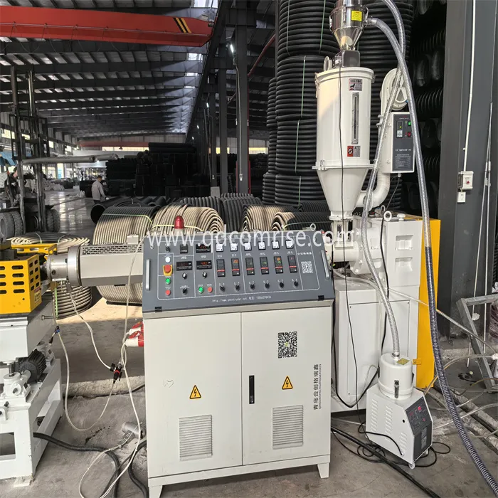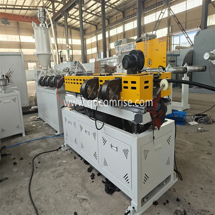 Paip memasuki corrugator, di mana ia dibentuk menjadi profil bergelombang menggunakan blok acuan dan tekanan vakum.
