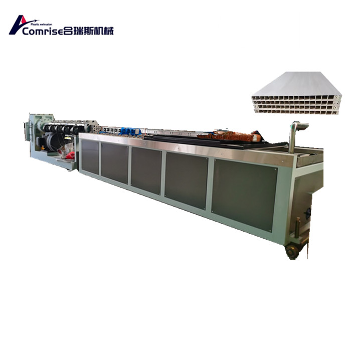 Barisan pengeluaran pintu PVC terutamanya digunakan untuk menghasilkan profil plastik PVC dengan bentuk dan ketinggian keratan rentas yang berbeza. Permukaan profil/panel PVC boleh dirawat dengan percetakan dan salutan dengan minyak berkilat, percetakan pemindahan haba, atau laminasi, yang boleh digunakan untuk dapur, bilik mandi, balkoni, dan banyak lagi.