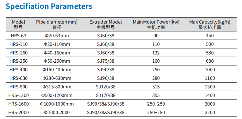 Kapasiti: Extruder skru tunggal, sesuai untuk memproses resin PE berkapasiti tinggi, dengan kapasiti maksimum 1000 kg/j. Diameter: Dari 16 hingga 800 mm. Mengguna pakai reka bentuk yang munasabah dan menyerap teknologi pengeluaran selamat, ia telah memperoleh sijil CE dan ISO
