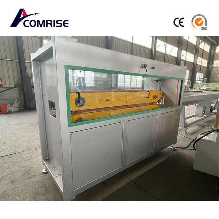 Pelet plastik → pemakanan vakum → extruder skru tunggal → penanda baris co mesin penyemperitan → acuan → tangki vakum → tangki penyejukan air → mesin daya tarikan → mesin pemotong → stacker atau pengembangan automatik dan mesin penggulungan